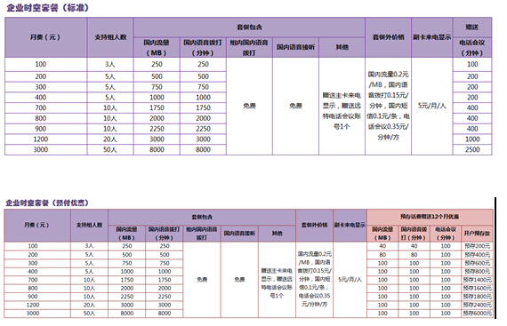 企业时空套餐(标准)共分9档,分别为3人组的月租100元,含国内流量250M,国内语音250分钟,而组内成员间语音免费,赠送主卡来电显示,赠送100分钟电话会议时长;5人组分为三档,月租从最低200元到最高400元不等,流量也是从500M到1000M不等,国内语音从500分钟到最高1000分钟,并赠送200分钟电话会议时长;10人组也分为三档,月租从最低700元到最高900元不等,流量也是从1750M到2250M不等,国内语音从1750分钟到最高2250分钟,并赠送400分钟电话会议时长;20人组一档,月租1200元,流量3000M,国内语音3000分钟,并赠送1000分钟电话会议时长;50人组一档,月租3000元,流量8000M,国内语音8000分钟,并赠送2500分钟电话会议时长。