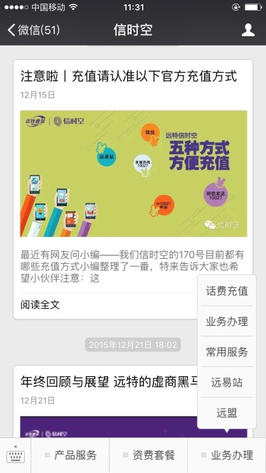 远特信时空微信营业厅以“信时空”为统一对外账号名称,是通过自助服务方式为用户提供服务的新型渠道。